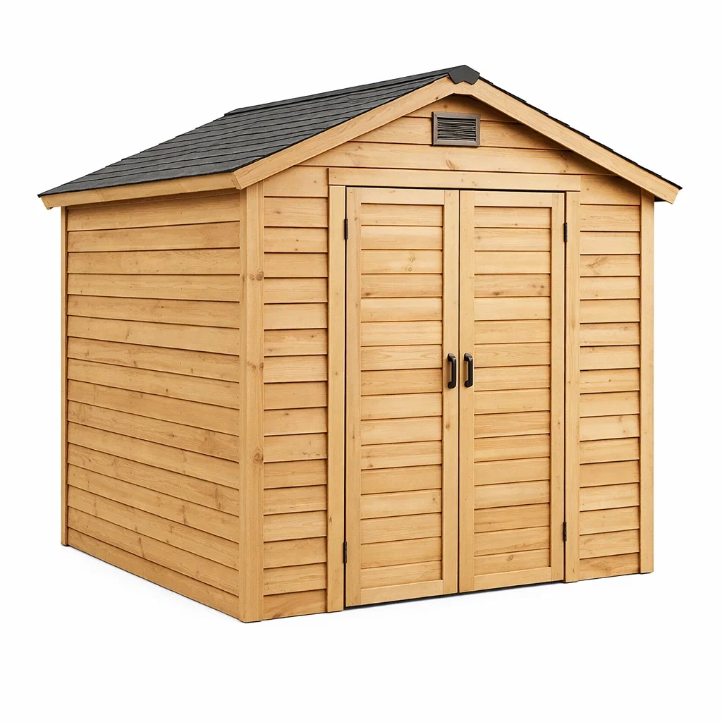 Détails des matériaux : Bois de sapin pour la structure, toit en panneaux bitumés