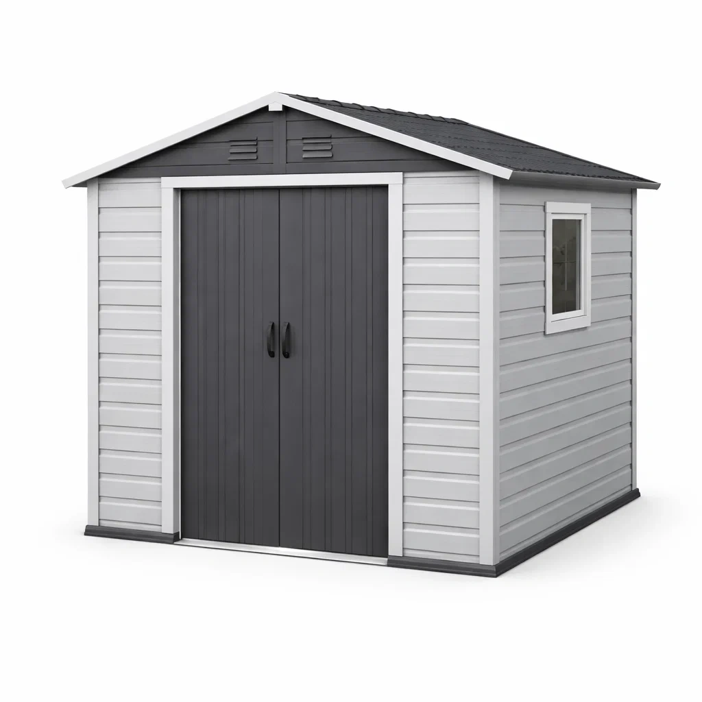 L'abri dispose d'une double porte pour un accès facile et comporte une fenêtre en polycarbonate pour la lumière naturelle. Il est équipé de deux ventilations pour assurer une circulation d'air adéquate.