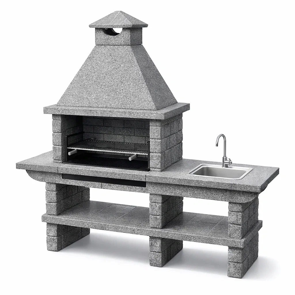 Ce barbecue en granit robuste dispose d'une structure durable. Il est équipé d'une grille en acier inoxydable ajustable, idéale pour les cuissons au charbon de bois. Un évier en acier inoxydable est intégré pour plus de commodité. Les dimensions générales sont de 200 cm de long, 80 cm de large et 210 cm de haut.
