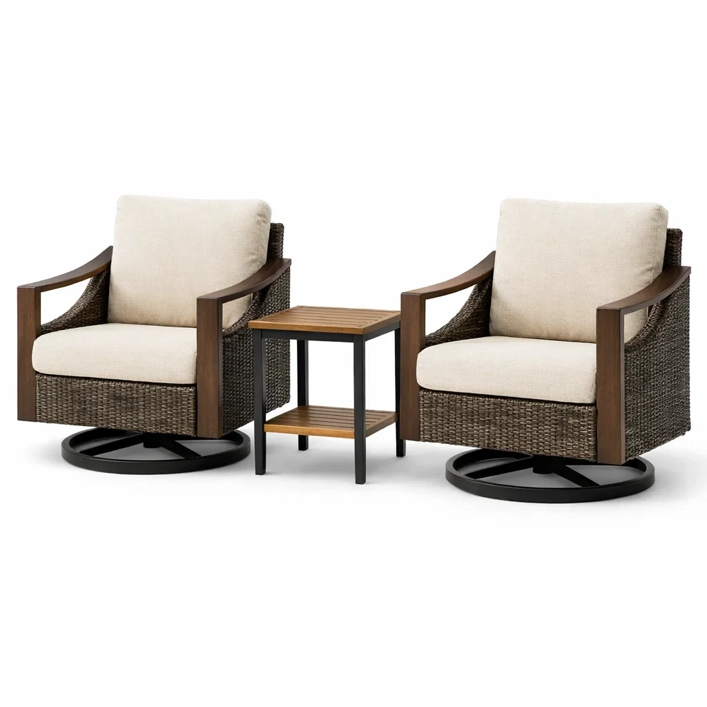Fauteuils pivotants avec structure en métal et bois, revêtement en résine tressée et tissu en polyester. La table d'appoint est en bois et métal. Le fauteuil et la table présentent des couleurs marron et beige.