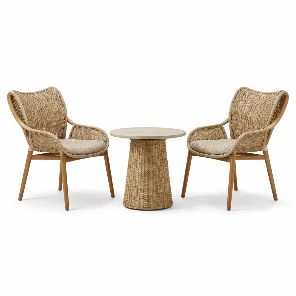 - Chaises : ossature en teck, revêtement en osier synthétique
