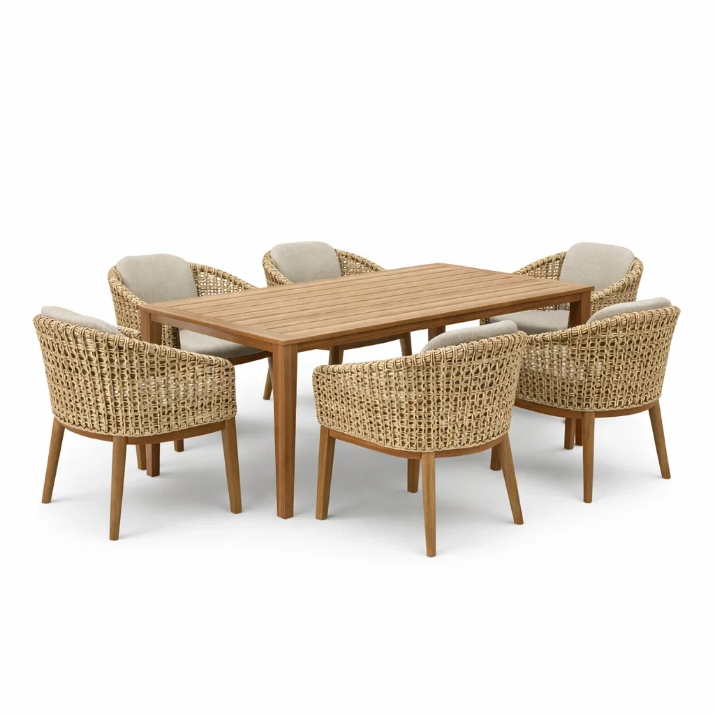 Matériau : Table en bois d'acacia, chaises avec structure en résine tissée, coussins en tissu polyester.