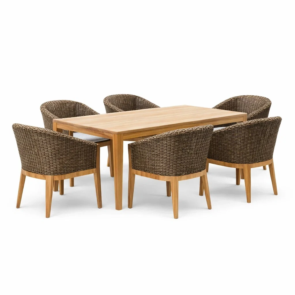 Le teck massif est durable et résistant aux intempéries, tandis que le rotin polyéthylène est facile à entretenir.