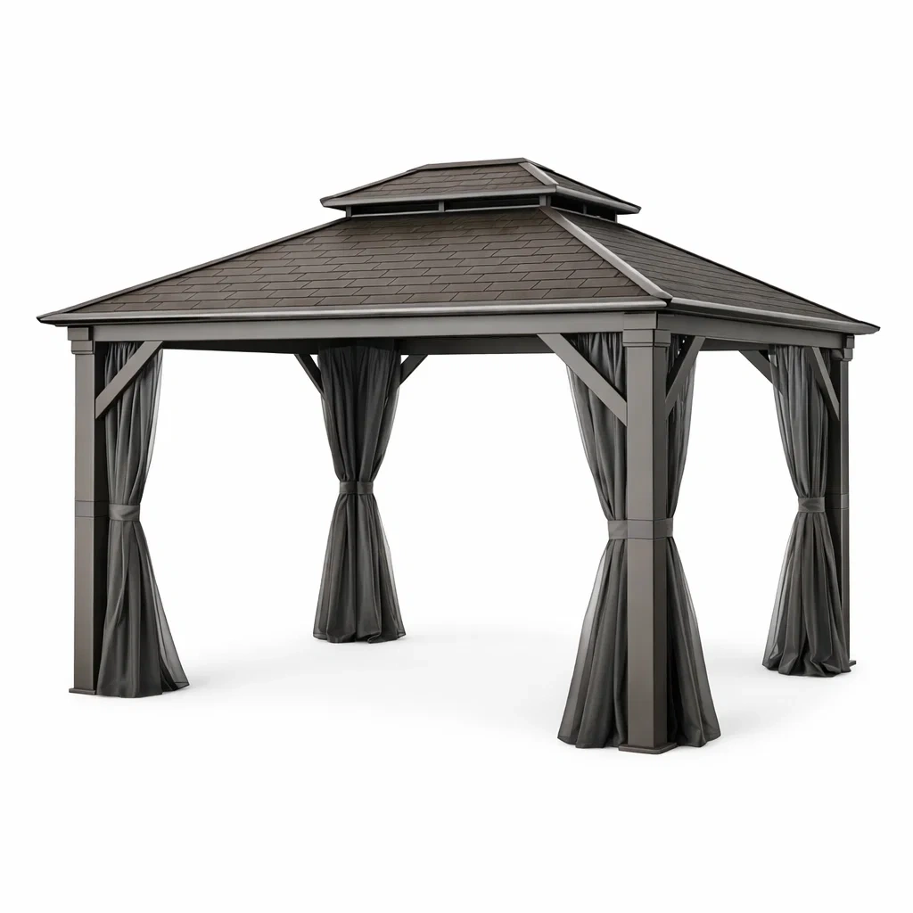 Des rideaux en polyester résistants aux intempéries sont inclus. Un nettoyage régulier avec un chiffon doux est conseillé pour l'entretien.