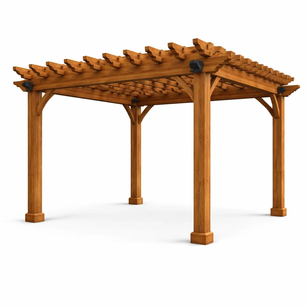 La pergola est fabriquée en bois massif, sans finition de surface.